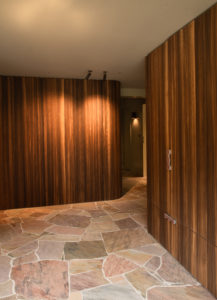 Meuble sur mesure réalisé en placage mélèze fumé vernis pour un hall d’entrée. On adore aussi le sol qui est un énigmatique puzzle interminable. Design by Afc Collection